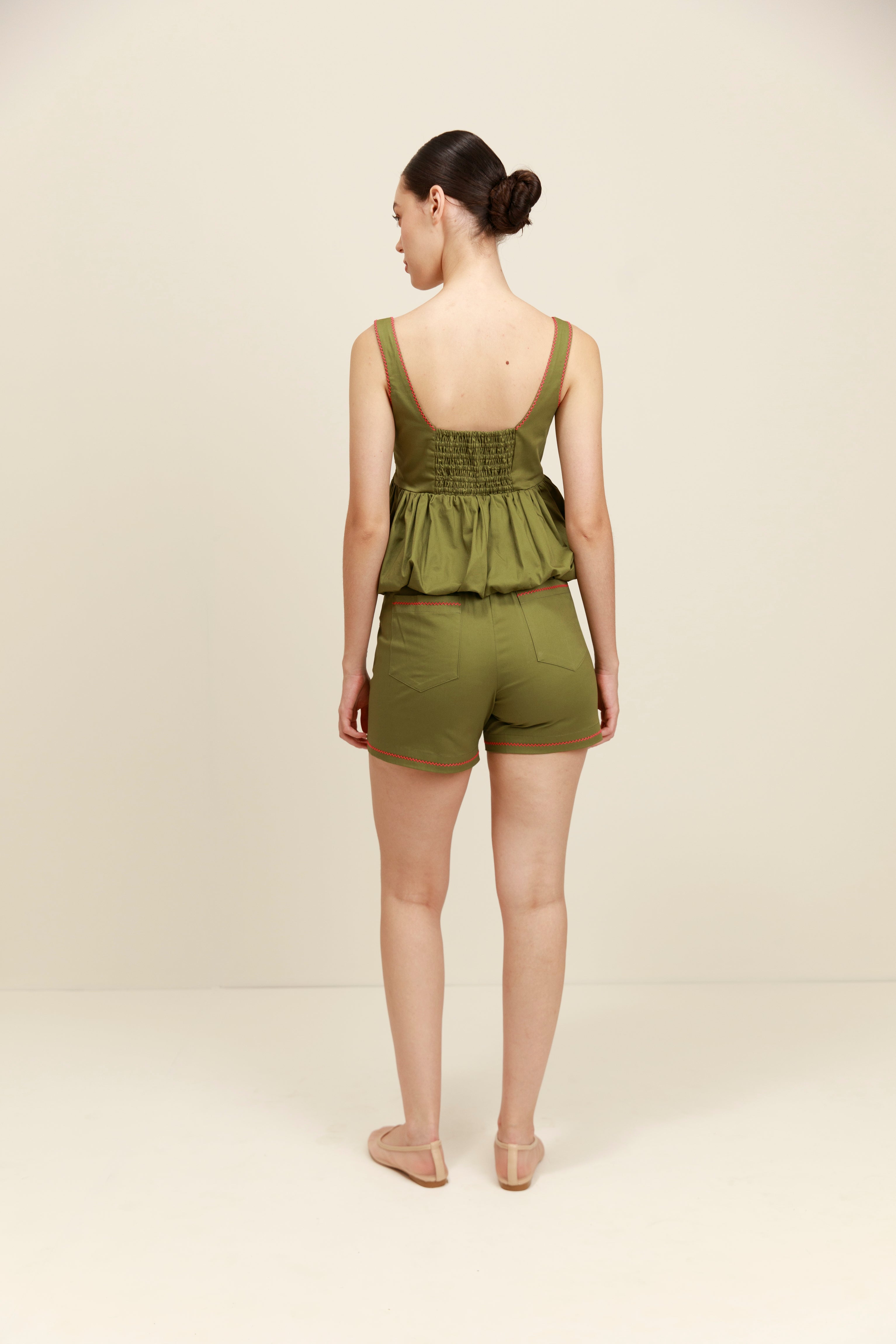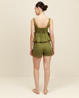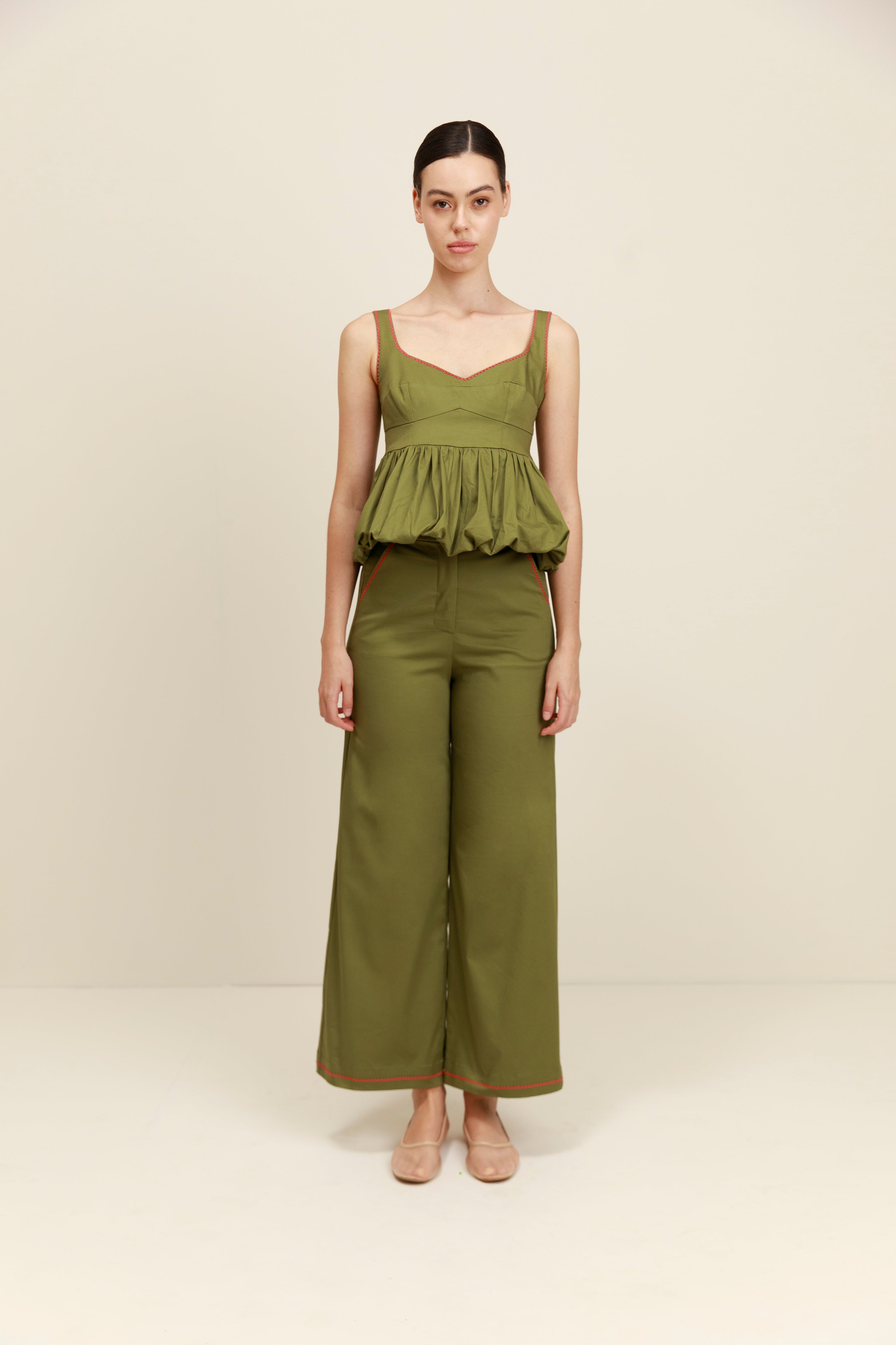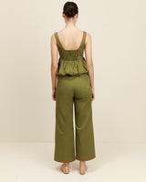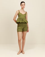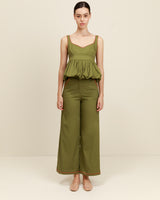 Elegancia sin esfuerzo en un tono atemporal. El top Etereo en color oliva combina un escote cuadrado, una cintura entallada y un bajo fluido estilo bailarina para crear una silueta que favorece desde todos los ángulos.