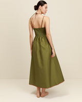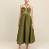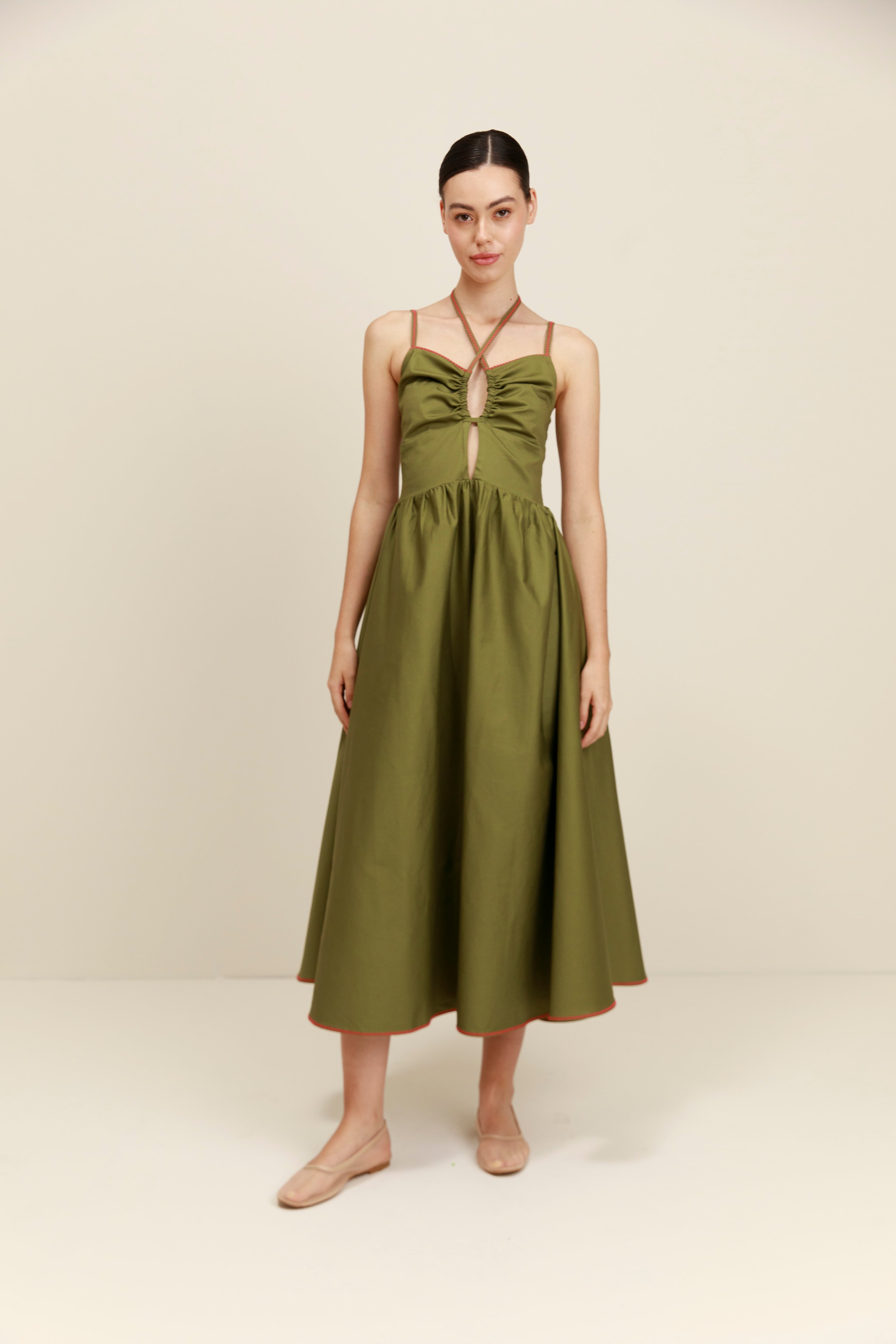 Entallado en la parte superior y holgado desde la cintura hacia abajo. Con detalles de bordados en zigzag y delicados tirantes, este precioso vestido verde oliva combina un encanto divertido con una elegancia natural.
