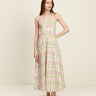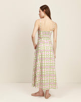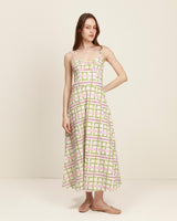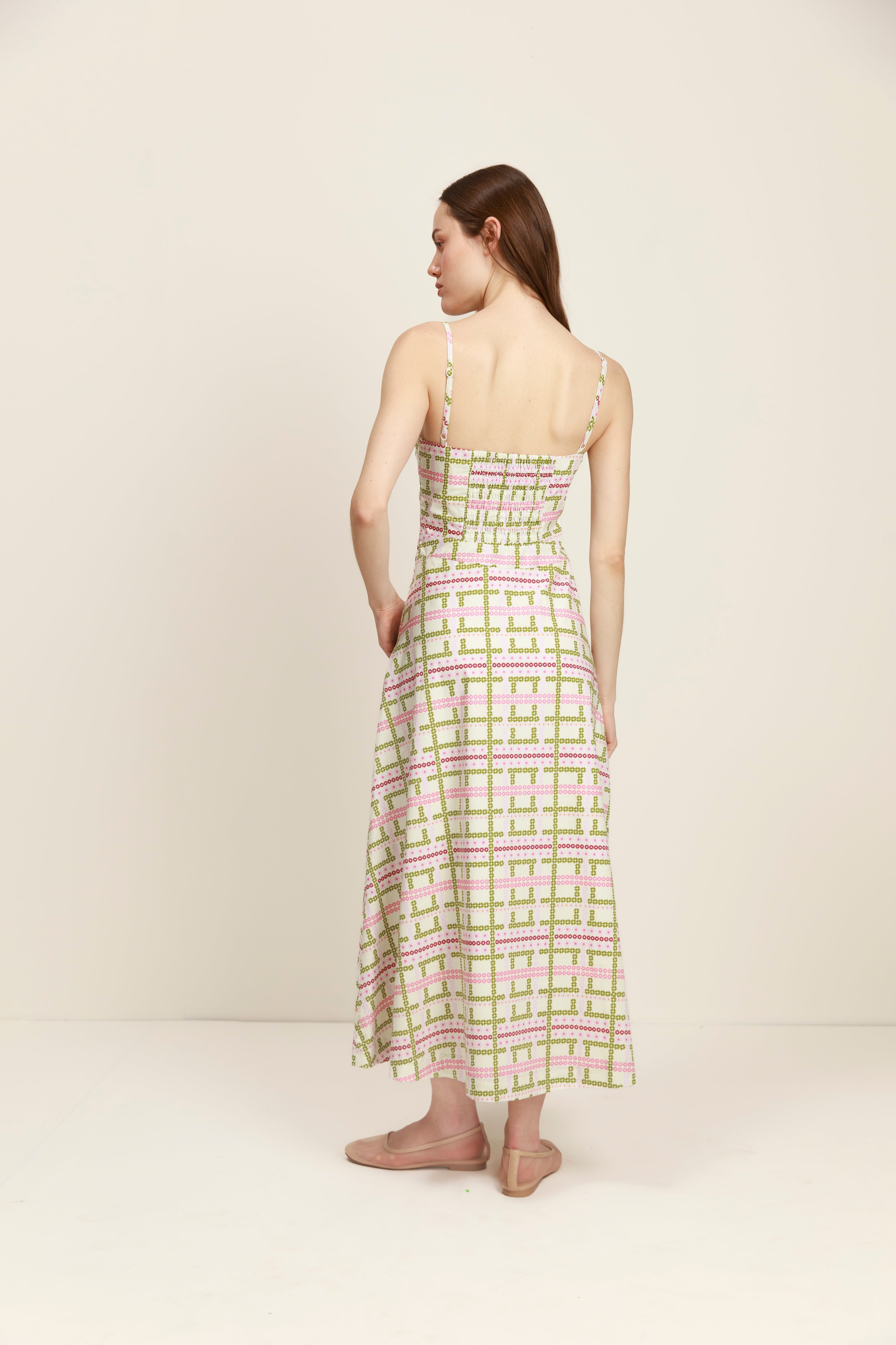 El vestido Flora que parece salido de un sueño en technicolor.  Juega con líneas y pequeños detalles que se cruzan como si estuvieran bailando, en tonos suaves que se sienten frescos