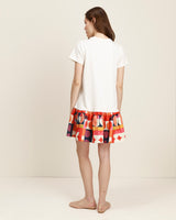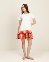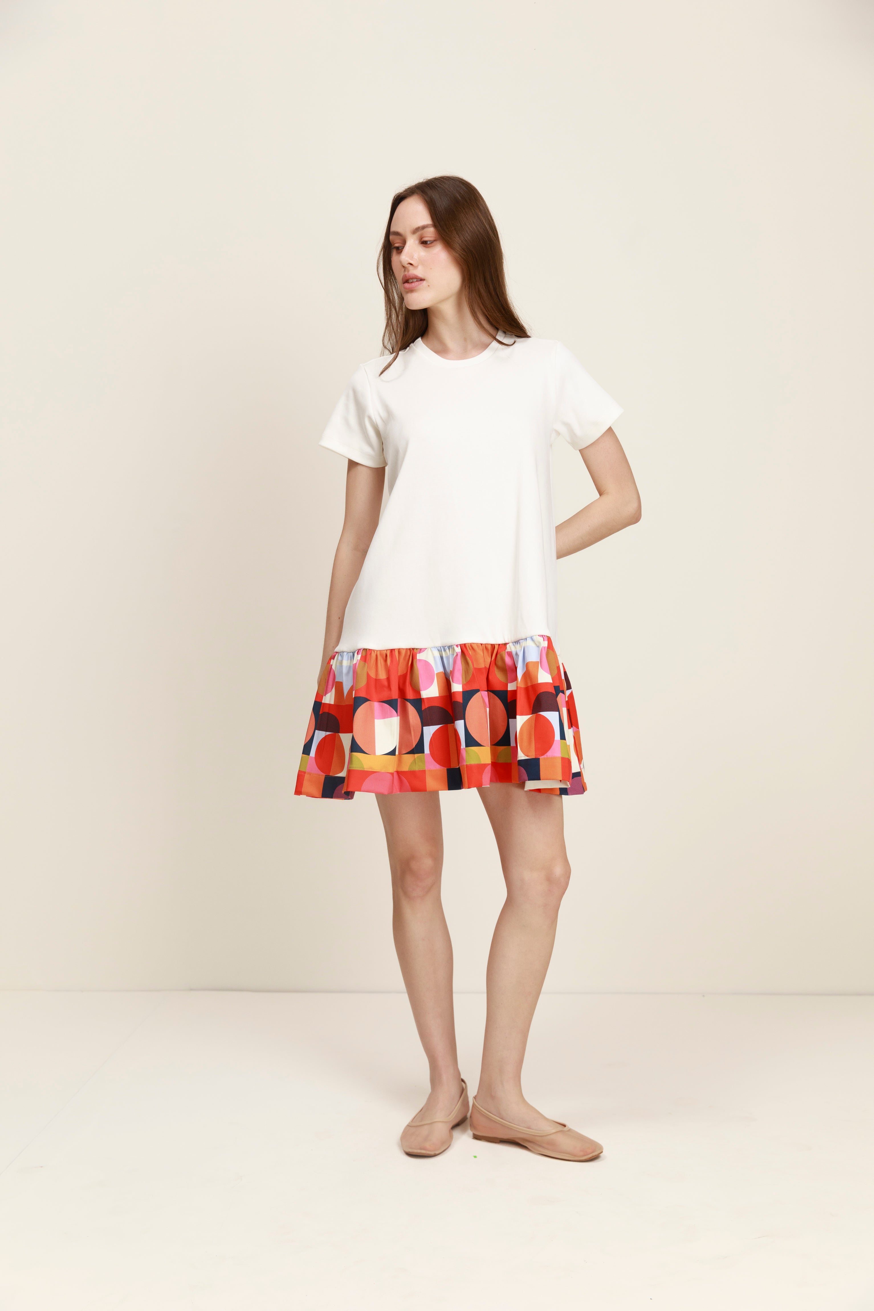 El vestido Studio combina simplicidad y expresión en una silueta relajada. Con cuerpo tipo t-shirt de líneas limpias y falda con volumen en contraste, crea un equilibrio entre lo esencial y lo gráfico.