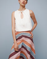 Descubre el top Eos, un ejemplo de sencillez y forma. Confeccionado en color marfil con un delicado detalle de lazo y un corte elegante, encarna la sofisticación discreta con un toque de encanto. Combínalo con la falda Opal para lograr un look armonioso, o llévalo con tus prendas favoritas de diario para conseguir un estilo atemporal y desenfadado.